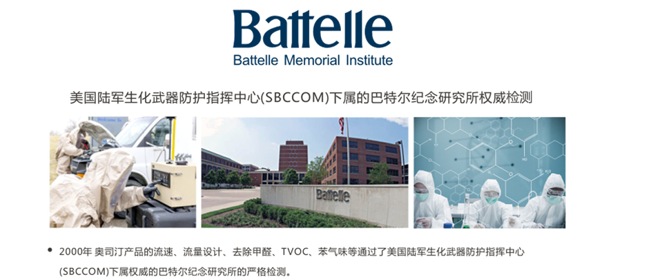 Battelle Memorial Institute紀念研究所)是總部設在美國俄亥俄州哥倫布市,在全球130個城市雇用了22000名科學家和研究人員,每年支配著高達65億美元的研發經費巴特爾美國的獨立研究機構,巴特爾紀念研究所是以科學、教育和慈善為目的設立的機構,在美國享受免稅待遇。奧司汀空氣凈化器通過巴特爾紀念研究所嚴格檢測。